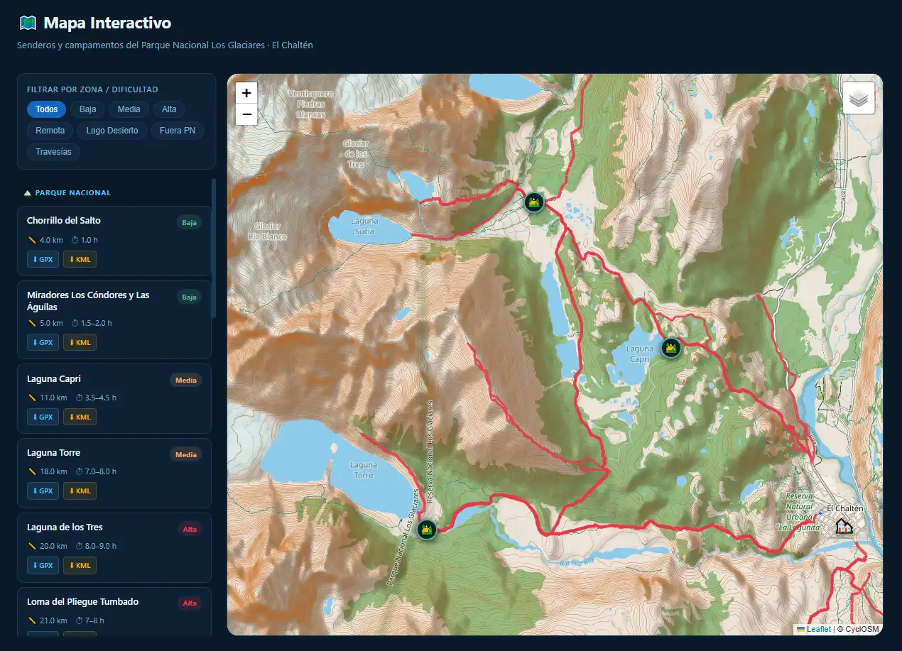 El mapa interactivo te muestra todos los circuitos del parque con sus tracks GPS, niveles de dificultad y puntos clave del recorrido. Puedes explorar las rutas desde tu casa, entender cómo se conectan los senderos entre sí y planificar exactamente qué días vas a hacer cada tramo. Sin improvisar en el campo!